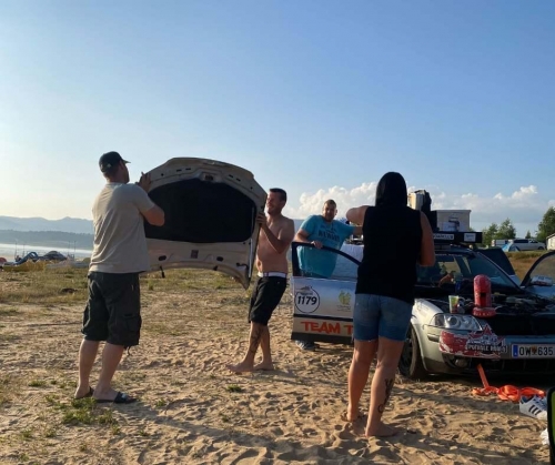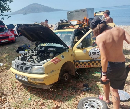 Bei der Überstellung ist Fernweh entstanden und nun steht er endlich zu Hause. Rauf auf die Bühne und mal auf Herz und Nieren testen. Da ein wenig einschweißen, dort ein bisschen stylen und zur Sicherheit noch ein Komplett-Service. Du bestehst den TÜV (so sagen die Deutschen) oder den Pickerltermin (so nennen Österreicher die §57a Überprüfung) bzw. den Nachweis einer positiven, technischen Untersuchung (das ist International). Dann kommen dir Bedenken. Es ist halt schon eine weite Reise. Vielleicht doch noch das Radlager tauschen? Und den Querlenker? Und… aber halt! Versuche keinen Neuwagen daraus zu machen. Schneller als du schauen kannst, hast du eine Lawine investiert. Die Erfahrung hat uns gelehrt, dass man unterwegs so ziemlich alles hinbekommt und sehr oft auch noch günstiger als zu Hause. Schnell kommt uns da der Benz vom Team Nachbrenner mit Mike & Roland in den Kopf, die in Griechenland schnell mal eine Zylinderkopfdichtung getauscht haben und erst um 3:00 Uhr morgens im Basislager waren. Was hat das für einen Applaus gegeben. Für uns waren sie die Stars des Tages und alle haben am Checkpoint den Geschichten gelauscht.